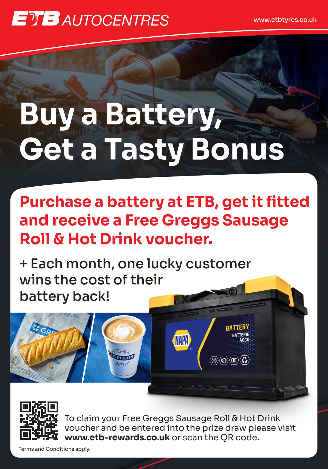 Purchase a battery at ETB, get it fitted and receive a Free Greggs Sausage Roll & Hot Drink voucher. Plus each month, one lucky customers wins their battery cost back!